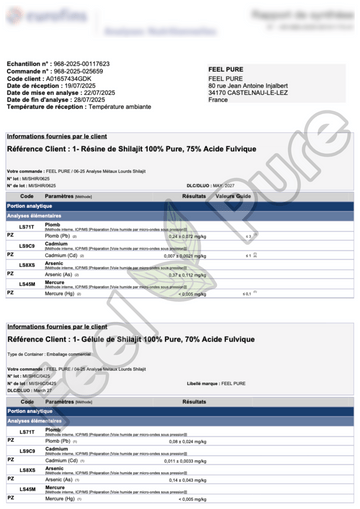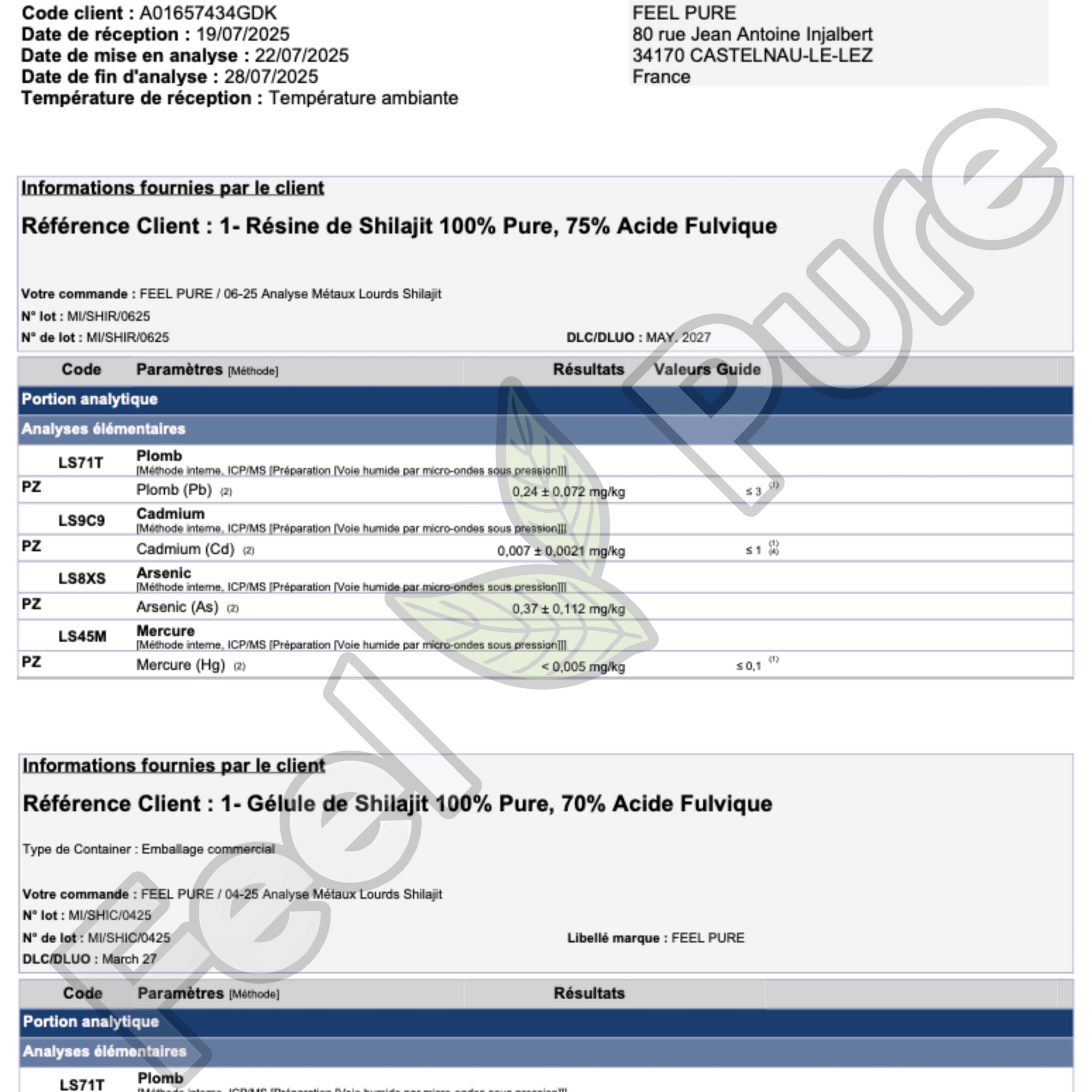 Chez Feel Pure, transparence et excellence sont au cœur de notre démarche. Nous sommes fiers de vous partager ces résultats pour vous offrir le meilleur Shilajit. 🍃